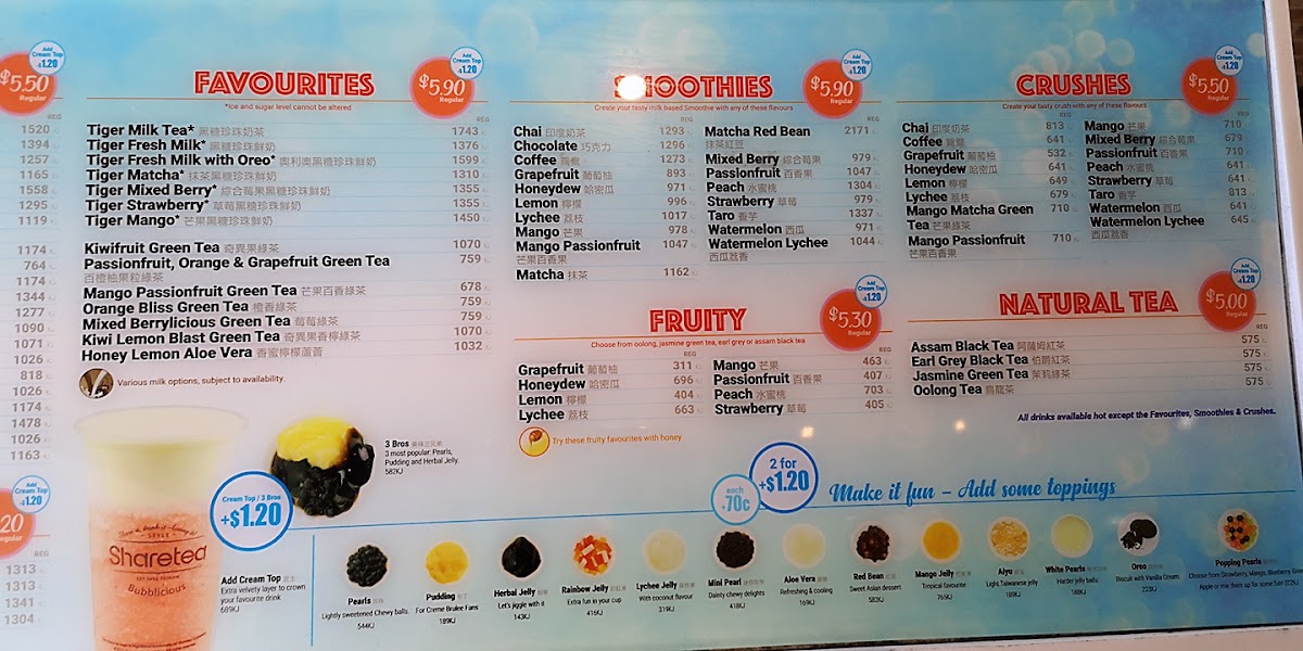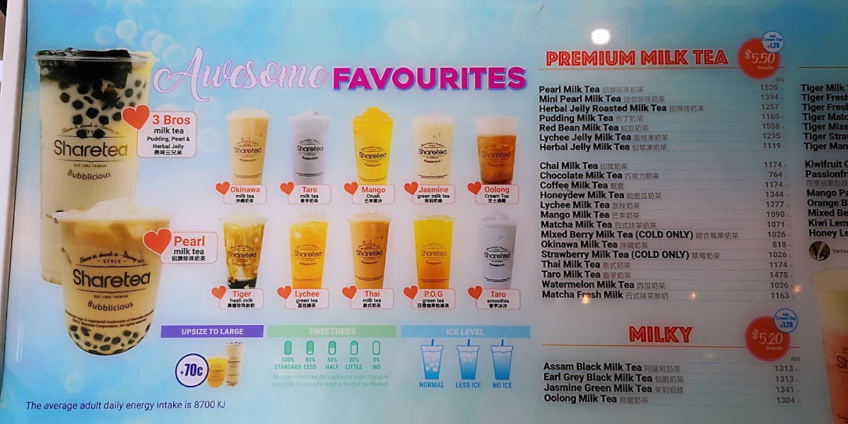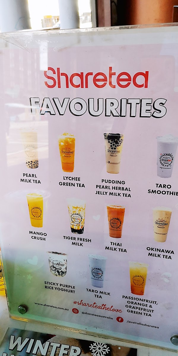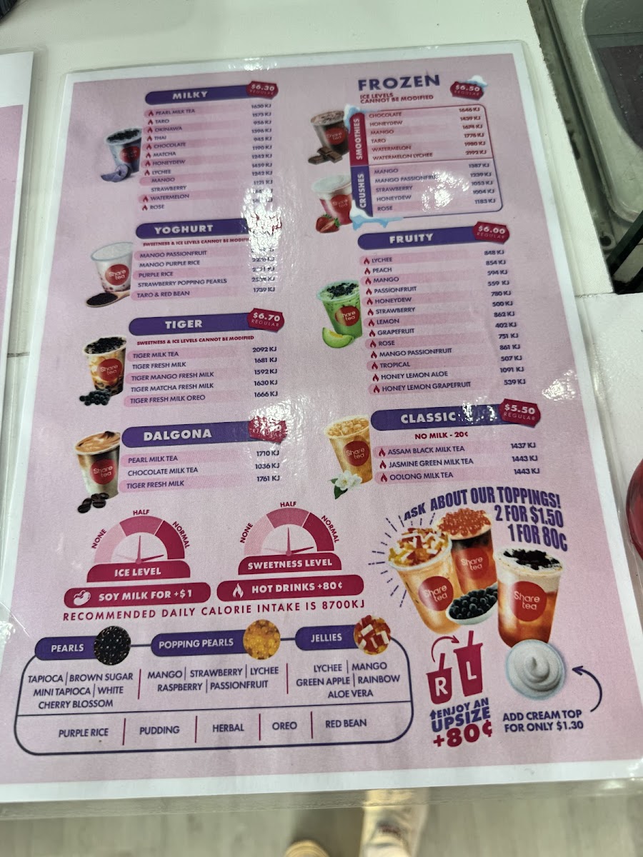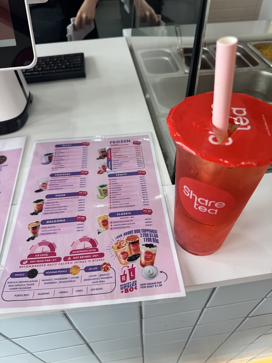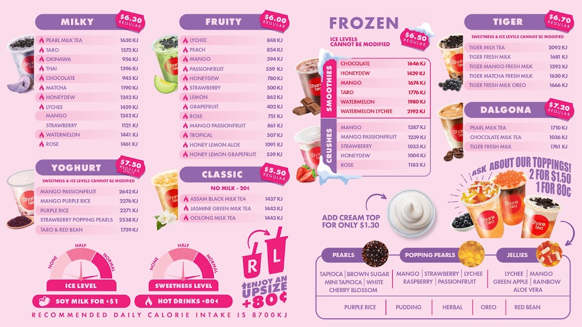 The menu at Sharetea Kingsford offers a wide variety of drinks to cater to every taste, with an impressive selection of milk teas, fruity drinks, smoothies, and new seasonal items. For those craving something creamy and indulgent, the Tiramisu Range features a Blueberry Yoghurt, while new products like the Matcha Tiramisu and Matcha Cheesecake provide a delightful fusion of flavors. The Guava Passion Fruit Juice Tea - Large and Guava Crushed Ice Pop are refreshing options for a fruity, cool treat. In the MILKY section, popular choices include Honeydew Milk Tea - Large and Taro Milk Tea - Large, alongside other favorites like Rose Milk Tea - Large and Okinawa Milk Tea - Large. The Tiger series introduces unique flavors like Tiger Fresh Milk and Tiger Mango Fresh Milk, and the Fruity options include refreshing drinks such as Lychee Fruit Tea - Large and Mango Fruit Tea - Large. For those who enjoy more experimental combinations, the Fruity Fusions like Watermelon Lychee Fruit Tea - Large and Passionfruit Grapefruit Lemon Fruit Tea - Large are sure to delight. The Fresh Tea section offers a choice of Jasmine Fresh Tea - Large and Assam Fresh Tea - Large for a classic experience. Sharetea also caters to those with a sweet tooth, offering an array of Smoothies, including Matcha Smoothie - Large and Chocolate Smoothie - Large, as well as Crushes like Lychee Crush - Large and Watermelon Crush - Large. Coffee lovers can explore options like Coffee Oolong Milk Tea - Large and Americano - Large under the Coffee Blend section. Additionally, there are yogurt options such as Lychee Purple Rice Yoghurt and Mango Passionfruit Yoghurt for a tangy, satisfying treat. Sharetea Kingsford's menu combines creativity with variety, ensuring there's something for everyone.